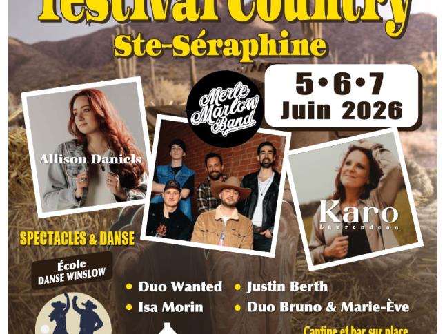 Viens écrire l’histoire du premier festival country de Sainte-Séraphine ! Trois jours de musique, d’artisans, de bouffe, de danse et de fun. Crée tes moments country avec ta gang !